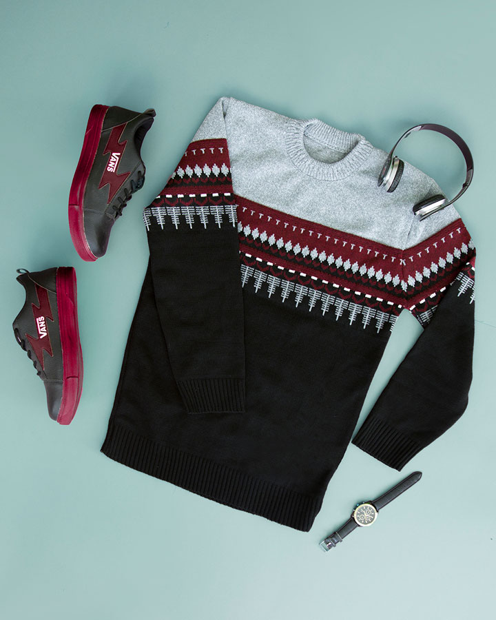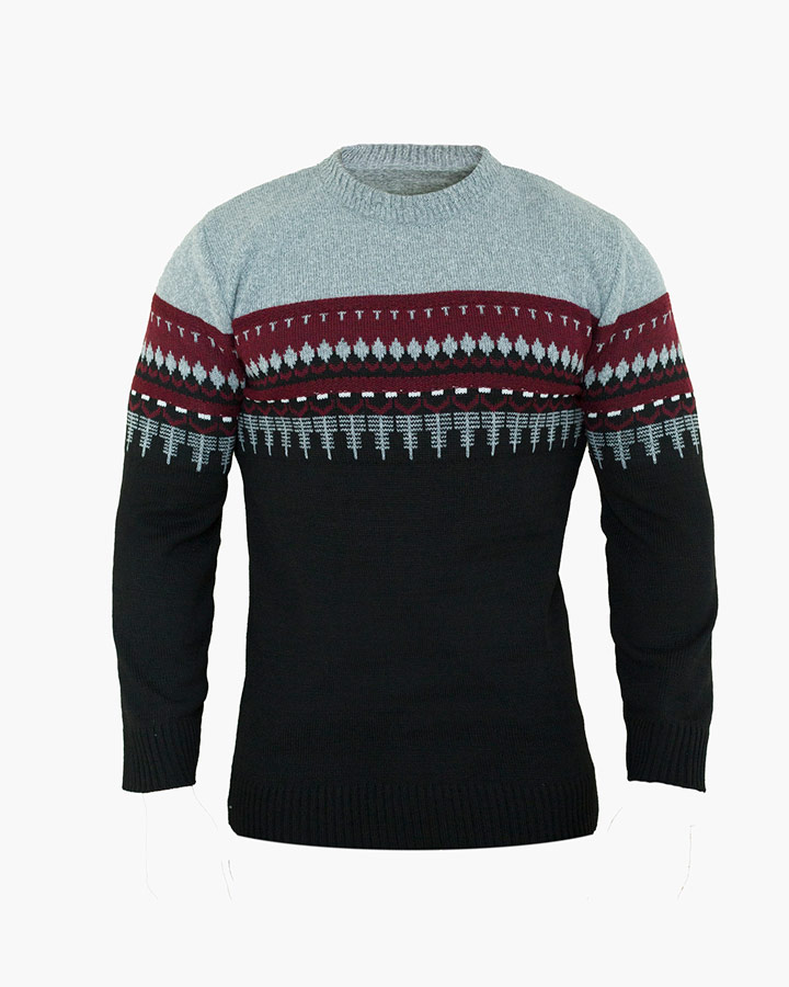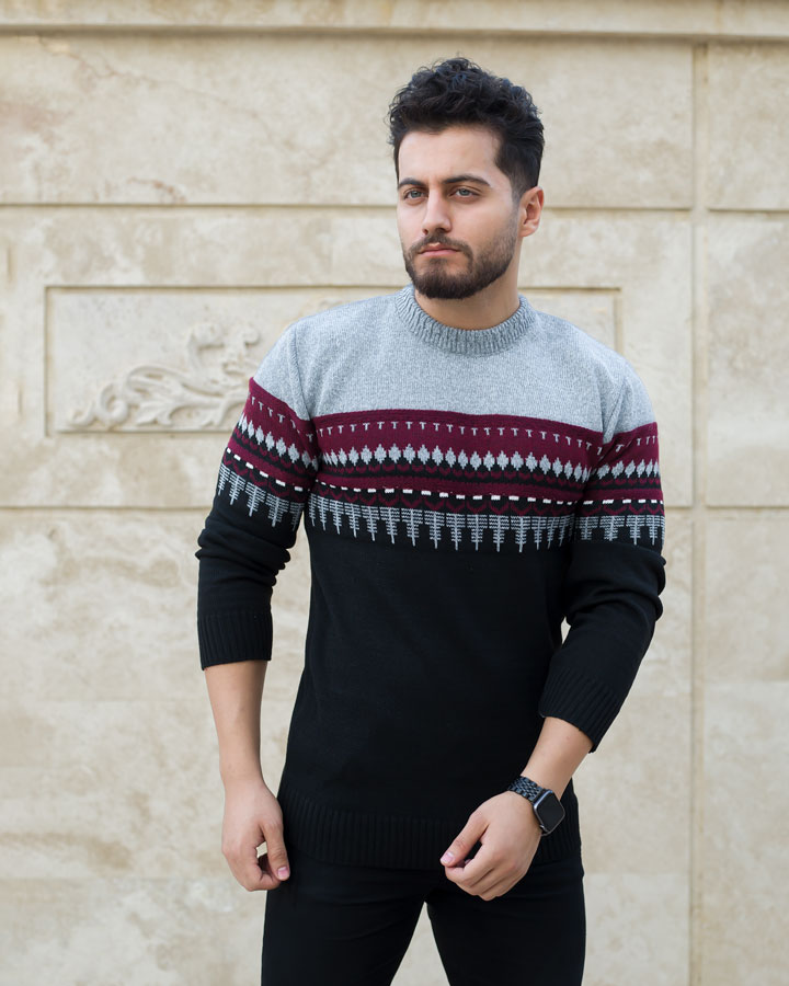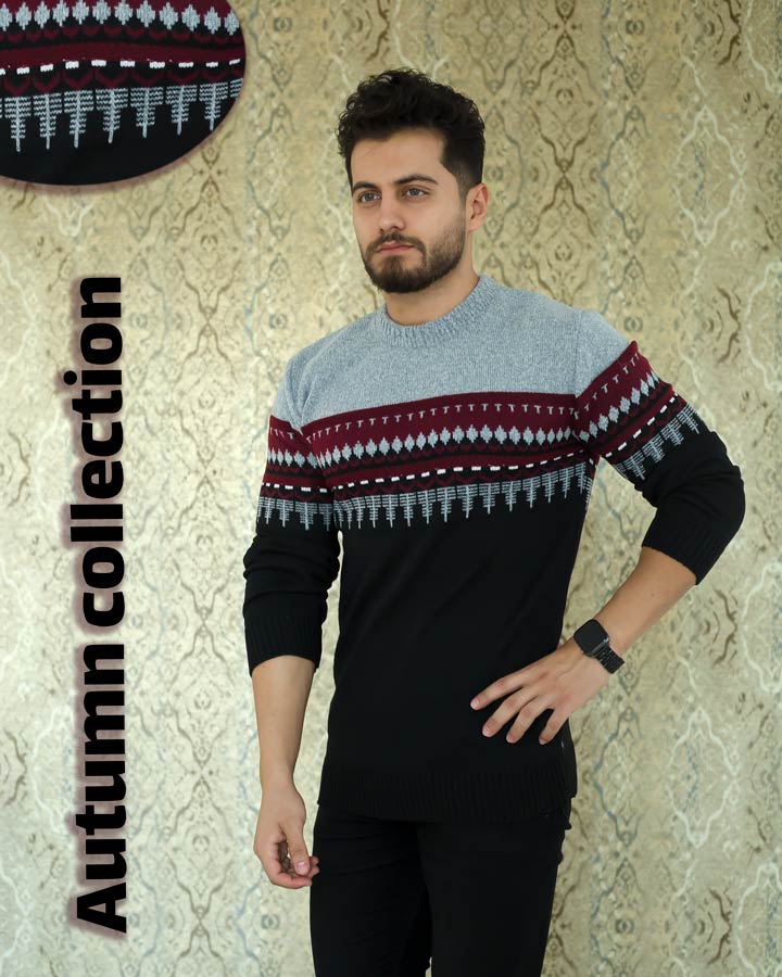 بافت مردانه efor طرح دار دارای استین های بلند و یقه گرد میباشد.در سایز بندی فری سایز ارائه میشود و در قسمت سر استین ها و پایین لباس دارای کش بافت است.