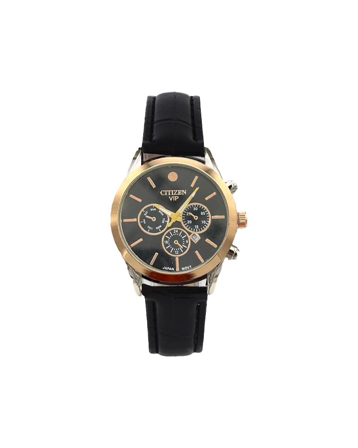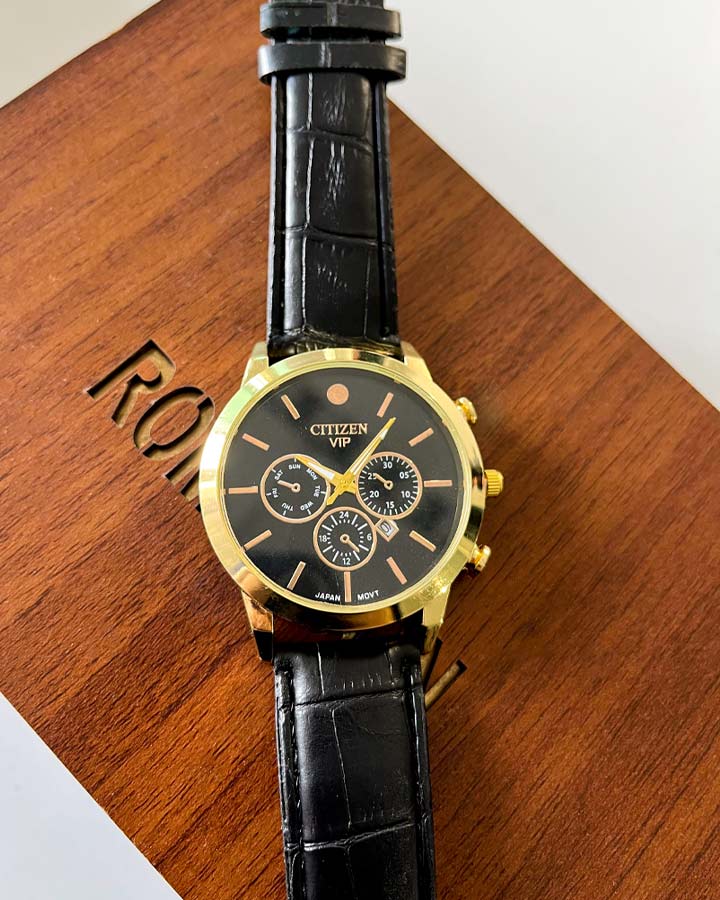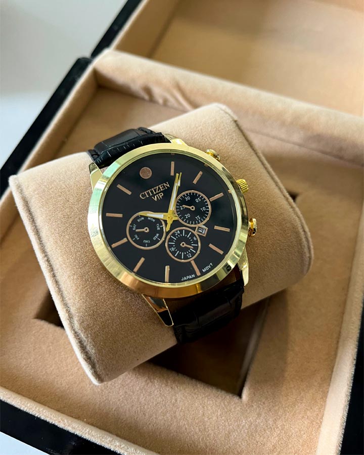 ساعت مچی عقربه ای cttizen vip ، با طراحی چشمگیر، همه را به سمت خود کشانده است. همچنین این ساعت.دارای تاریخ شمار میباشد که میتواند روزهای ماه را برای شما به نمایش درآورد. صفحهی ساعت سه موتوره طراحی شده و همین چشم همه را به سمت خود خیره کرده است. کیفیت قاب از استیل بسیار مرغوب طراحی گردیده است و همچنین دارای بند چرم مصنوعی با کیفیت میباشد.