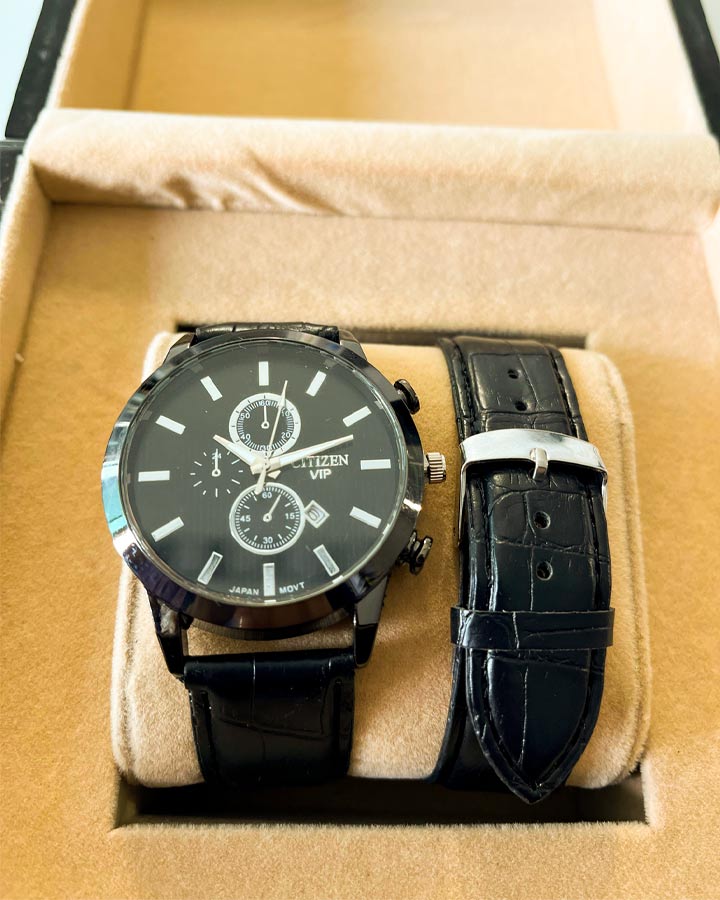 ساعت مچی عقربه ای cttizen vip ، با طراحی چشمگیر، همه را به سمت خود کشانده است. همچنین این ساعت.دارای تاریخ شمار میباشد که میتواند روزهای ماه را برای شما به نمایش درآورد. صفحهی ساعت سه موتوره طراحی شده و همین چشم همه را به سمت خود خیره کرده است. کیفیت قاب از استیل بسیار مرغوب طراحی گردیده است و همچنین دارای بند چرم مصنوعی با کیفیت میباشد.