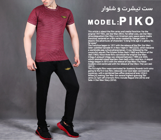 ست تیشرت و شلوار piko متشکل از یک تیشرت و یک شلوار بوده می باشد .تیشرت این ست دارای آستین های کوتاه بوده .شلوار این ست نیز دارای کمر کشی پهن می باشد و از قد شلوار 105 سانتی متری برخوردار است.ست تیشرت و شلوارpiko فری سایز بوده که برای سایزهای لارج و ایکس لارج مناسب می باشد.