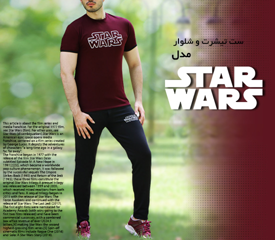 ست تیشرت و شلوار star warsمتشکل از یک تیشرت و یک شلوار بوده می باشد .تیشرت این ست دارای آستین های کوتاه بوده و از قد متوسط 72 سانتی متری برخوردار می باشد.شلوار این ست نیز دارای کمر کشی پهن می باشد و از قد شلوار 100 و فاق 30 سانتی متری برخوردار است.ست تیشرت و شلوارstar wars فری سایز بوده که برای سایزهای لارج و ایکس لارج مناسب می باشد.