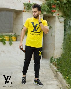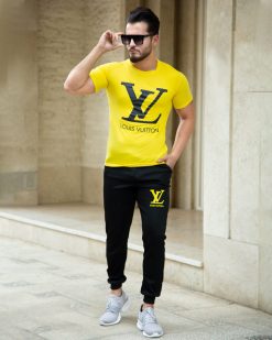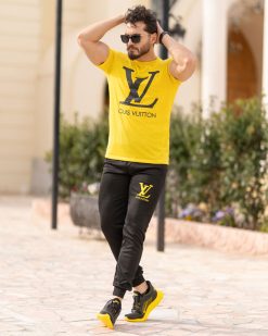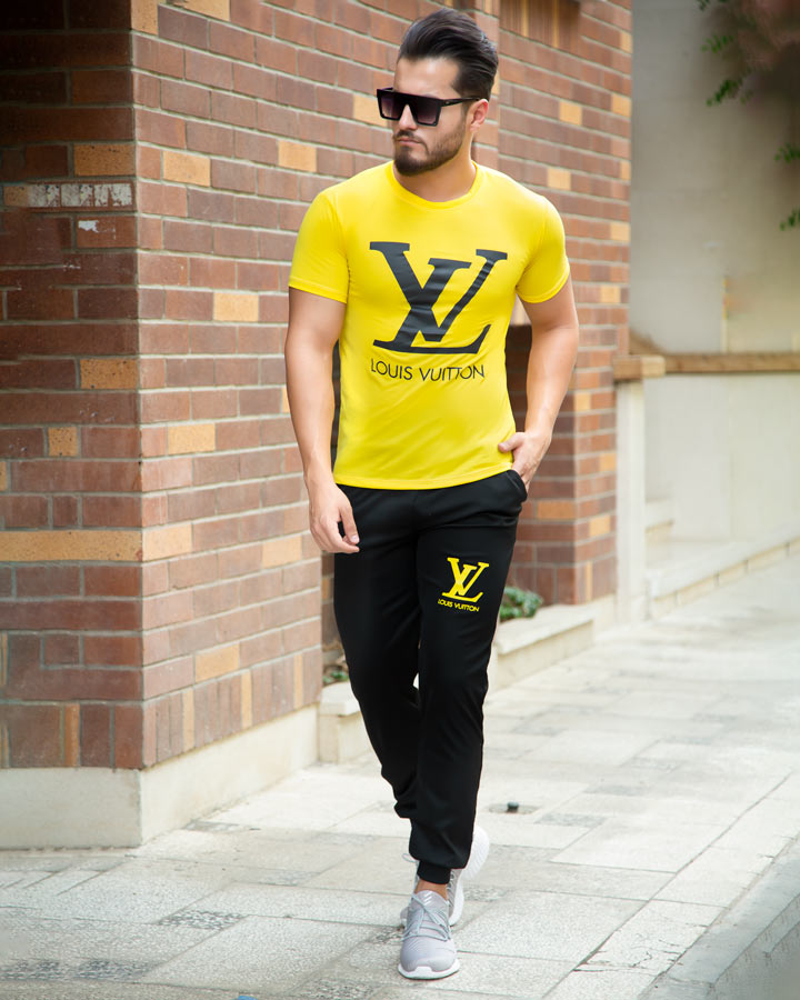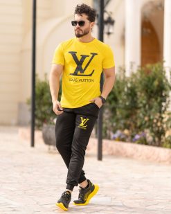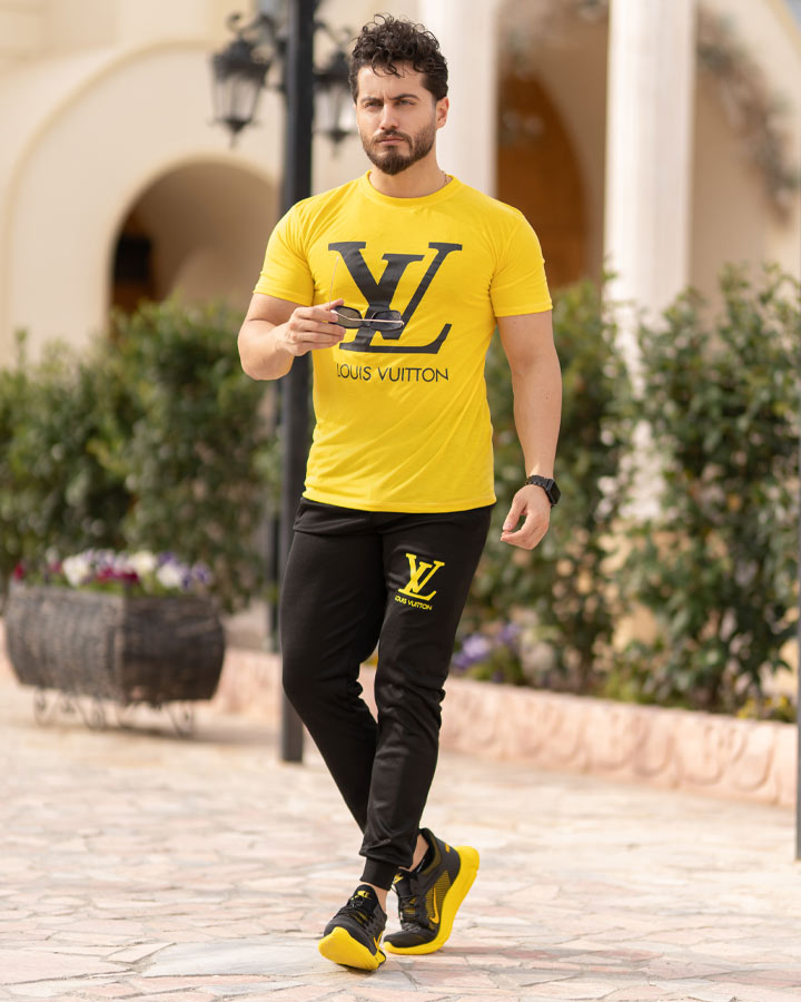 ست تیشرت و شلوار مردانه در رنگ بندی زرد و مشکی با چاپ برند LV روی تیشرت ارائه شده است.تیشرت دارای استین های کوتاه و جنس اسپان دارای الیاف سبک و مناسب فصل گرما میباشد.شلوار این ست به رنگ مشکی و با جنس ملانژ با الیافی انعطاف پذیر است.