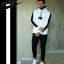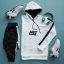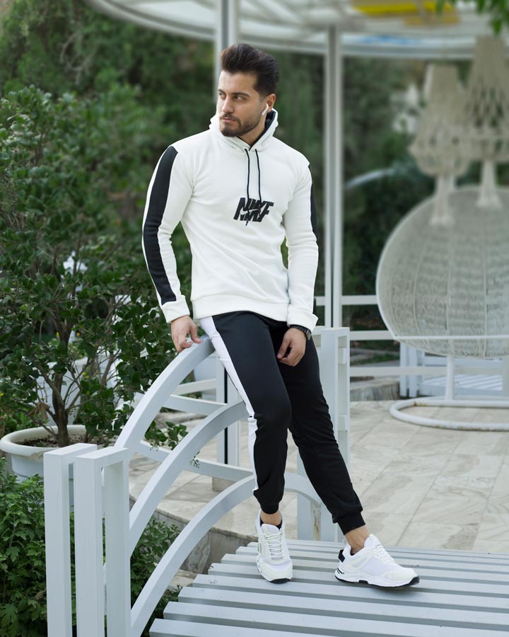 ست دو تکه مردانه شامل یک عدد سویشرت و یک عدد شلوار بوده که جنس ان از اسپان و ملانژ است.رنگ بندی این کار سفید مشکی بوده و در دو سایز لارج و ایکس لارج تولید شده است.شلوار این ست در قسمت جلو دارای دو جیب است و دم پای ان گت دارد
