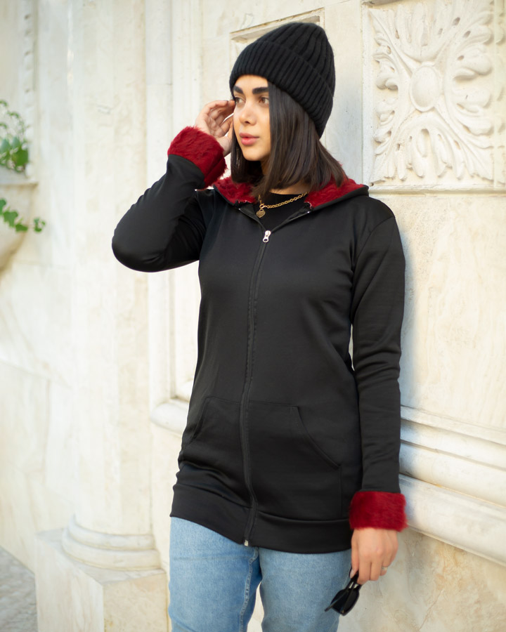 سویشرت یکی از گزینه های انتخابی برای فصل سرماست.این محصول که از جنس دورس تو کرک تهیه شده همراهی گرم و مناسب فصل است.در قسمت سر استین ها و کلاه سویشرت خز استفاده شده و نحوه ی بسته شدن آن به صورت زیپ میباشد.این محصول فری سایز بوده و مناسب سایز 36 تا 42 است