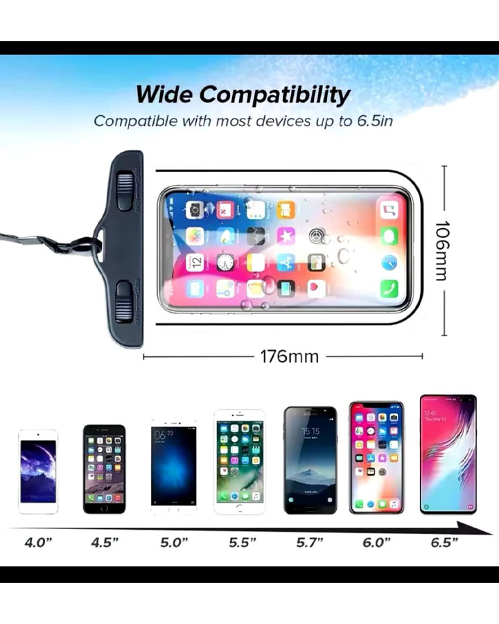 کاور ضدآب گوشی ، برای استفاده از گوشی موبایل در زیر آب طراحی شده است. این محصول میتواند انواع گوشیهای موبایل را درون خود جای دهد و اجازه دهد کاربر گوشی، آن را با خیال راحت به زیر آب ببرد. ضدآببودن کیف تا عمق 20متری تضمین شده است و در چنین عمقی، هیچ آبی به درون کیف نفوذ نخواهد کرد. با استفاده از این کیف میتوانید زیر آب هم از گوشیهای هوشمند لمسی استفاده کنید.