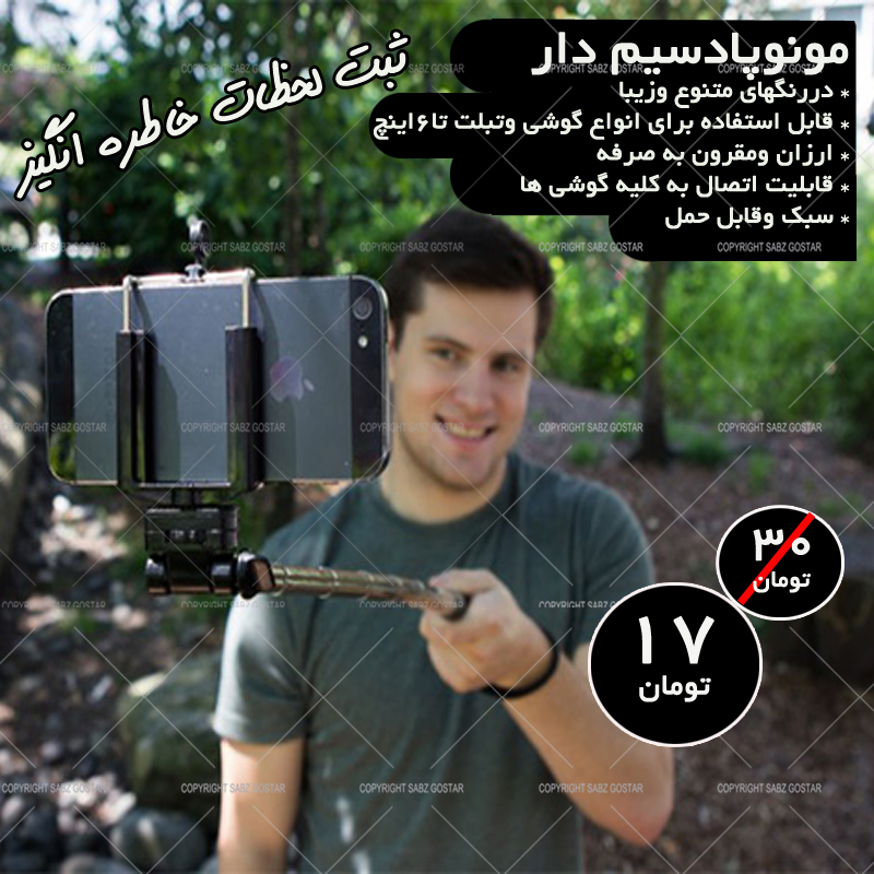 اما بهترین کاربرد مونوپاد سیم دار برای تصاویر سلفی به شکلی تکی و چند نفری می باشد ، می توانید موبایل را بالای سرتون بگیرید و از دید پرنده ها عکس برداری کنید