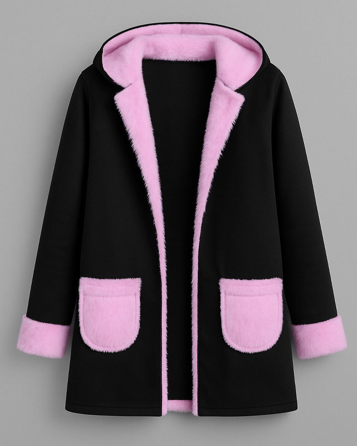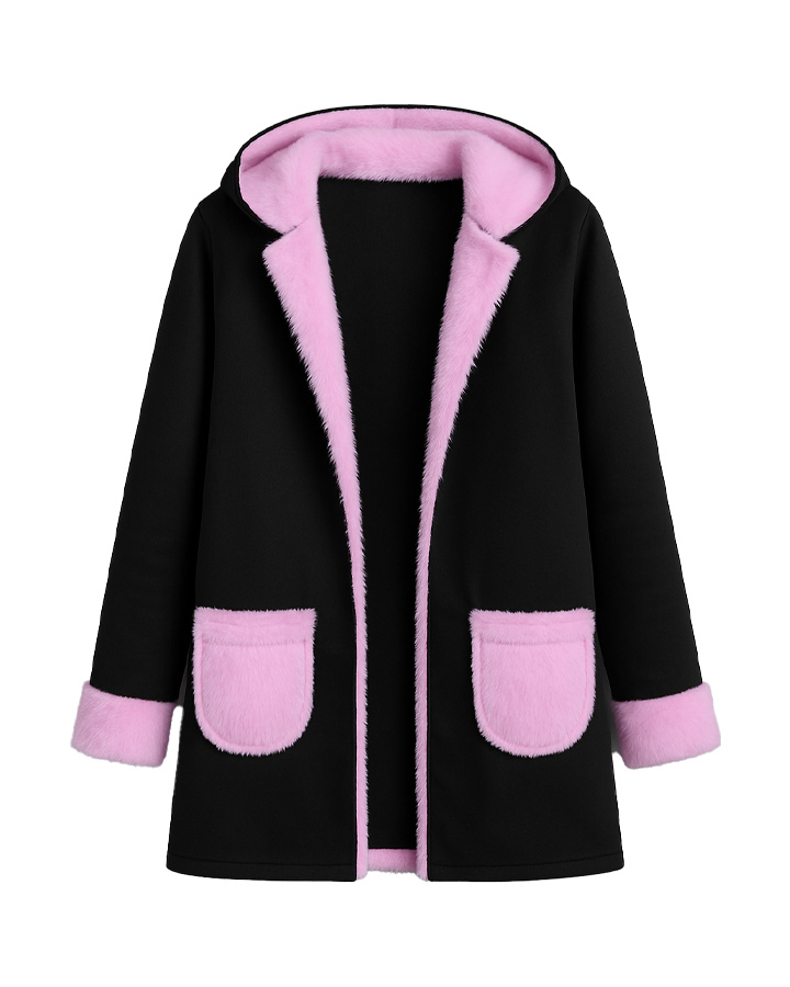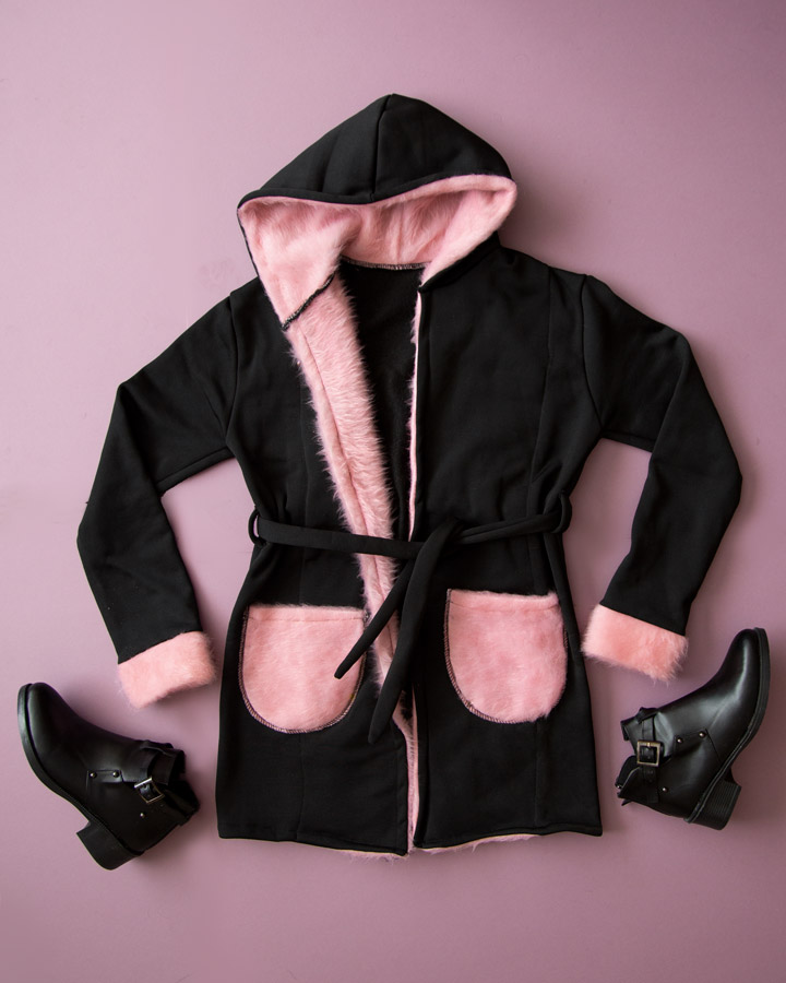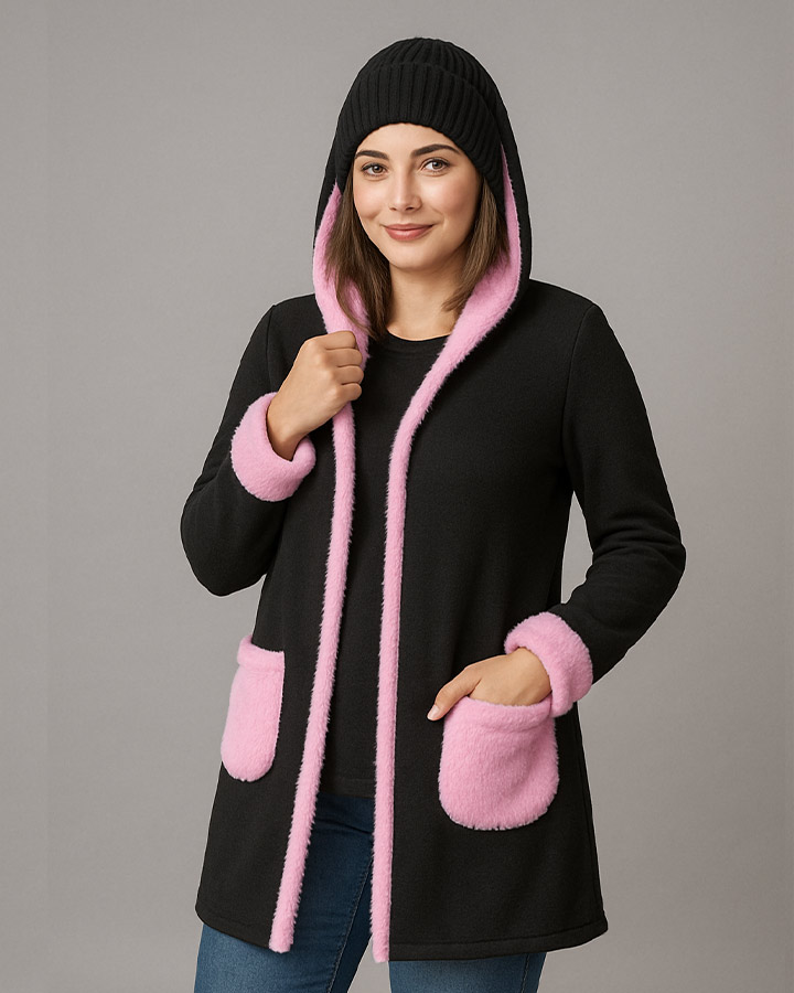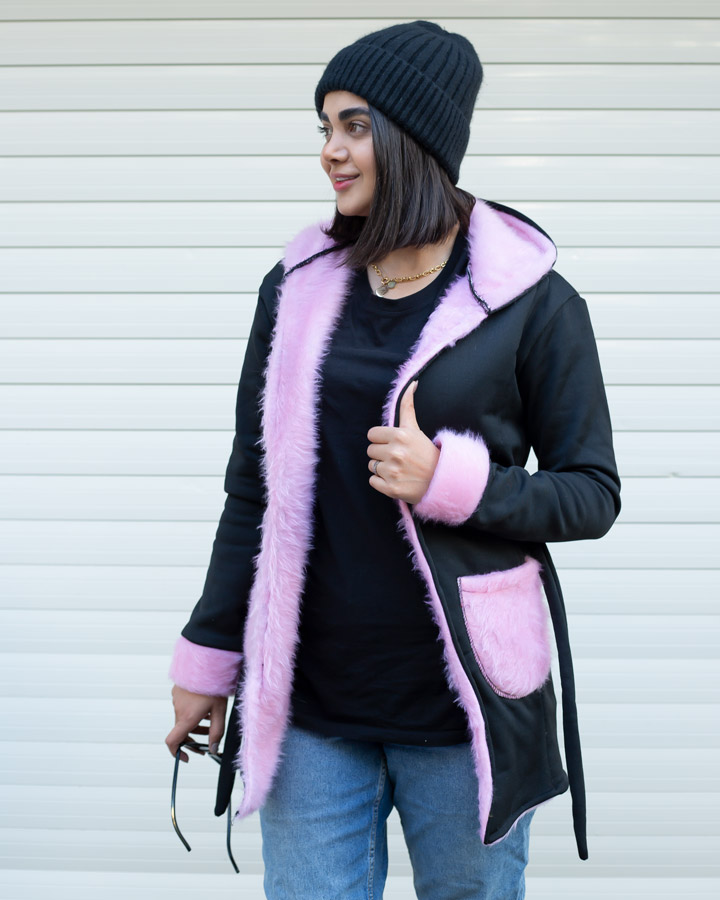 این هودی با ترکیب جذاب رنگ مشکی و خز صورتی، ظاهری متفاوت و چشمگیر بهت میده.
