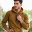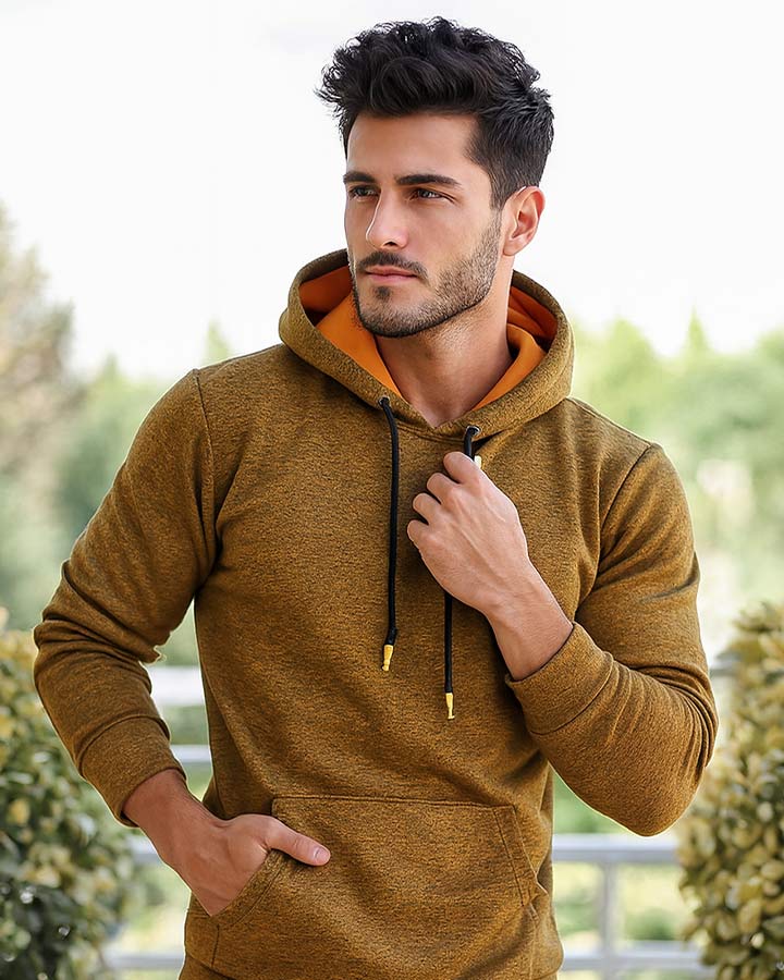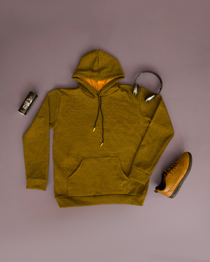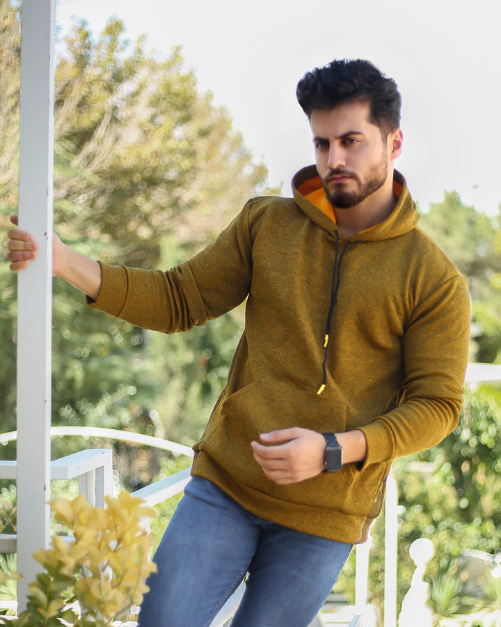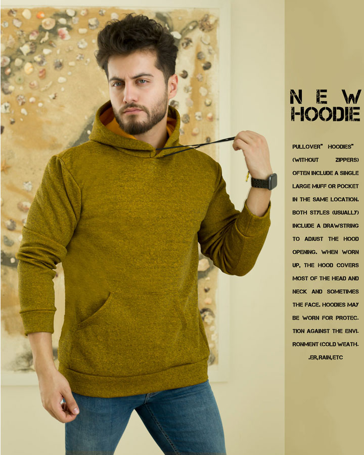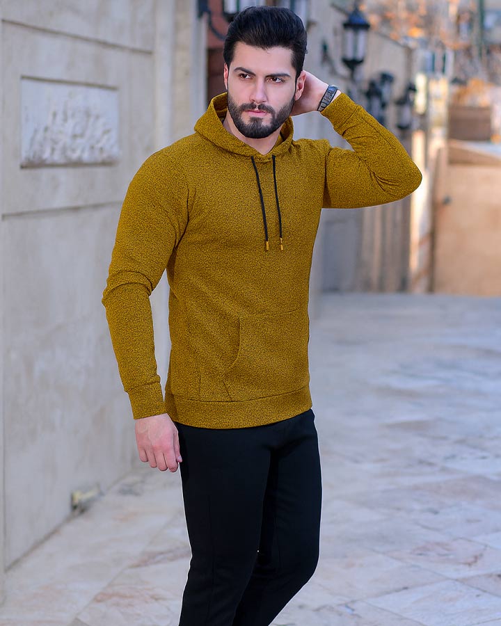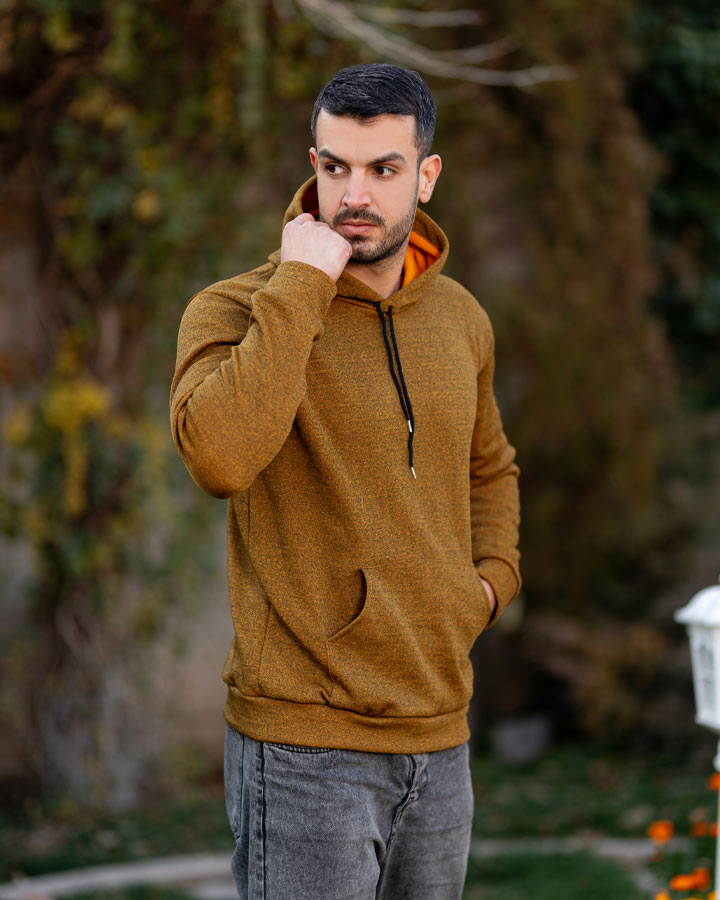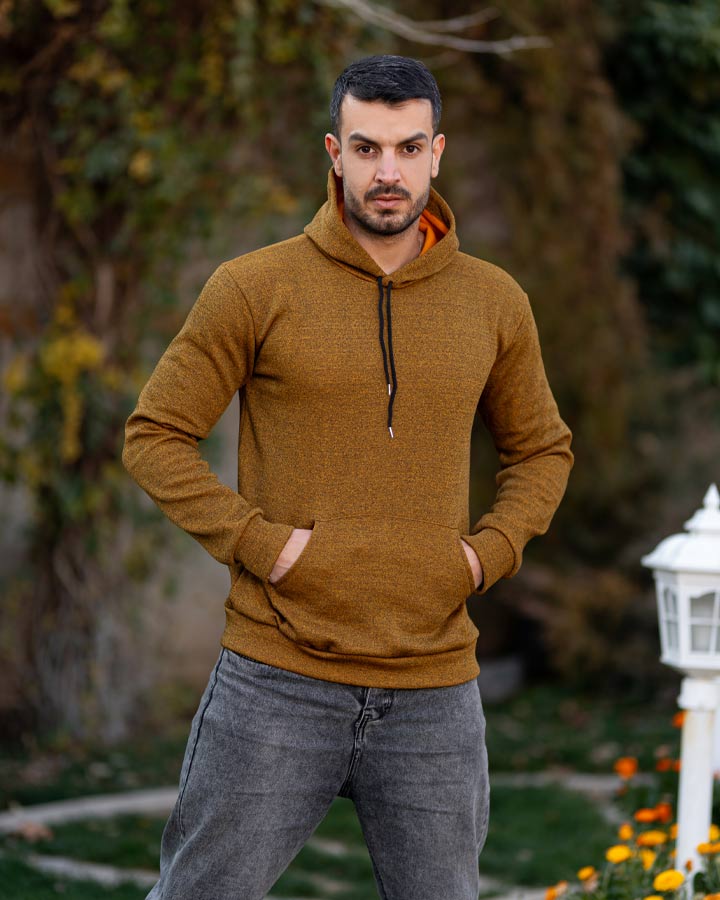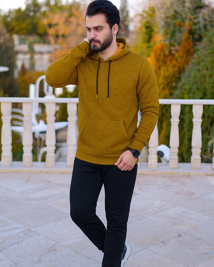 هودی مردانه با رنگ خردلی دارای کش بافت در سر استین ها و پایین لباس است و جنس ان دورس تو کرک میباشد. این محصول کلاه دار و در سایز لارج و ایکس لارج تولید شده است.