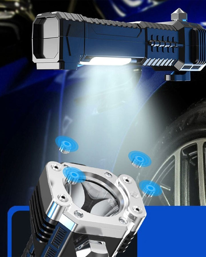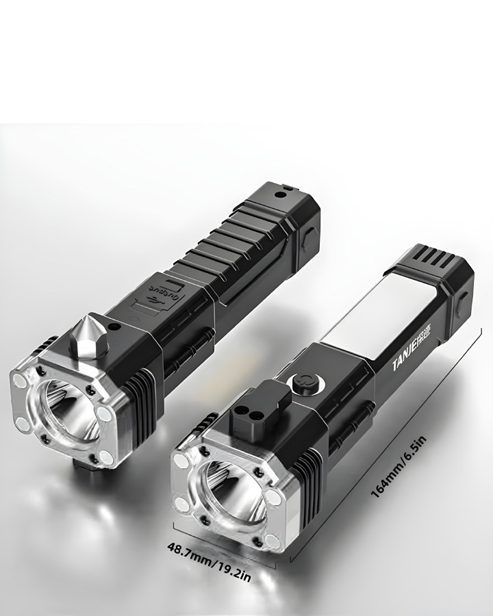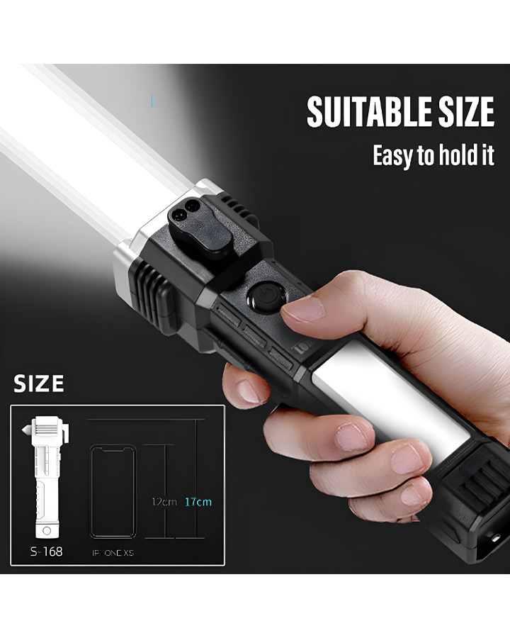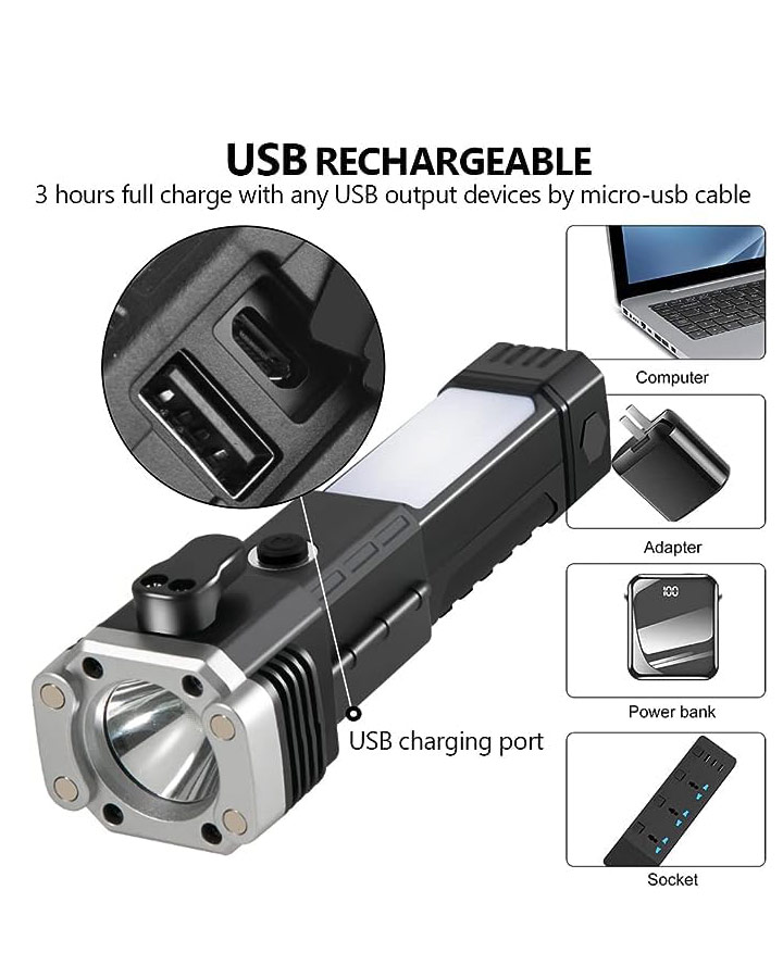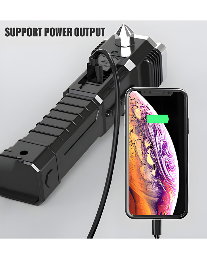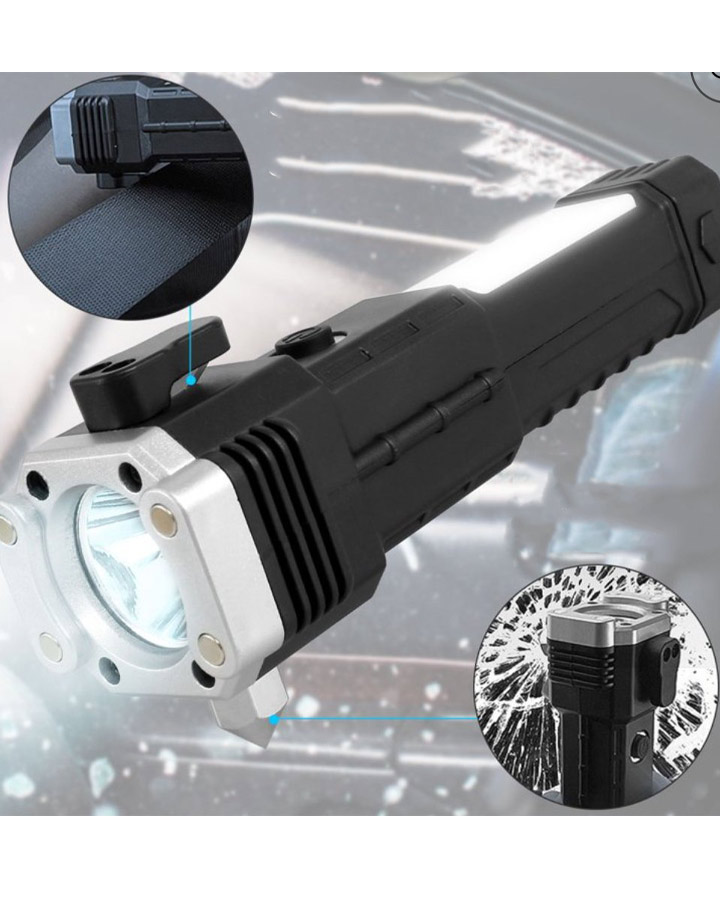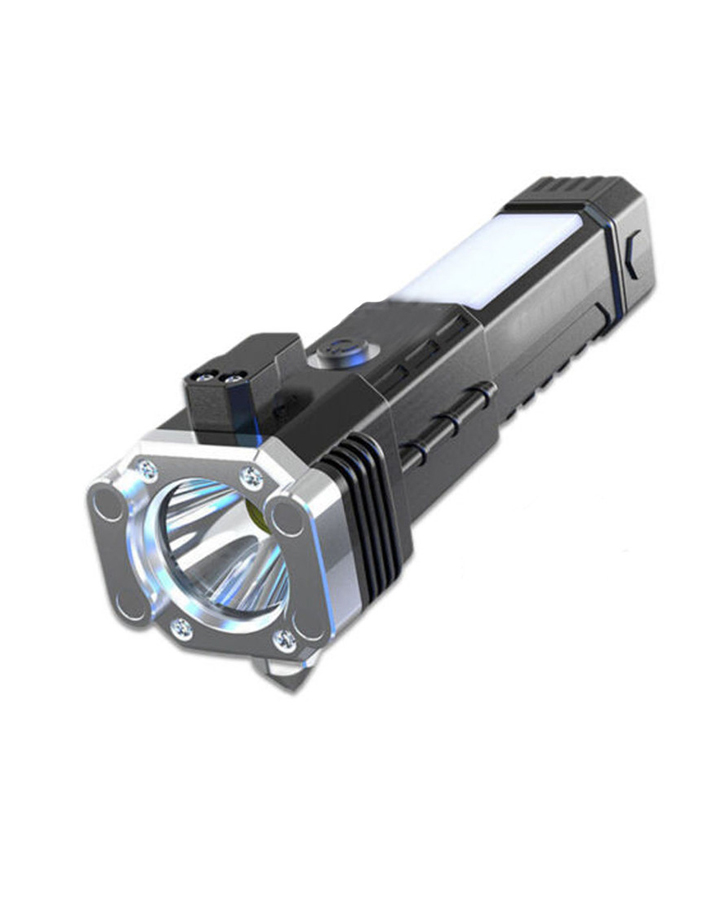 چراغ قوه دستی 8 کاره مدل led torch با قابلیت انجام کارهای فراوان از جمله 3 حالت نور- دارای چکش اتش نشانی-دارای تیغ مخفی برای بریدن کش و طناب.دارای مگنت اهن ربا برای چسبیدن به اهن و تعمیر خودرو- قابلیت استفاده بعنوان پاور بانک در مواقع اضطراری-قابلیت شارژ شدن توسط شارژر موبایل میباشد. این چراغ قوه پر کاربرد وسیله ای عالی برای مسافرت و کمپینگ و نگهداری در خودرو است و داشتن ان میتواند بسیار به شما کمک کند.