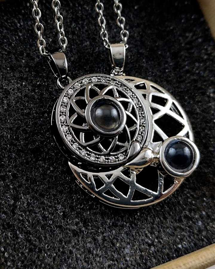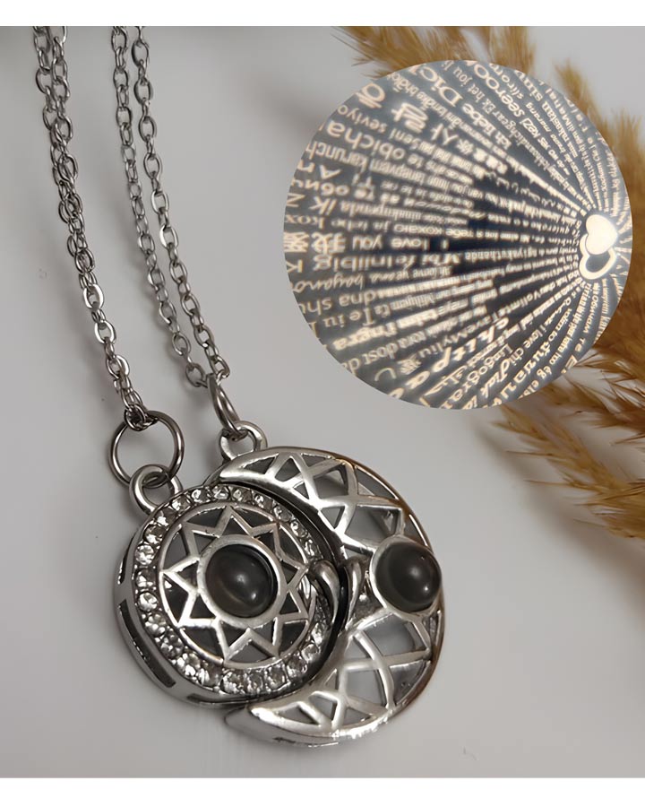 روی هر گردنبندیک سنگ تلسکوپی تعبیه شدهکه وقتی ازنزدیک به ان نگاه میکنیم جمله ی “ دوستت دارم “ به صد زبان از جمله فارسی و انگلیسی روی ان نوشته شده است