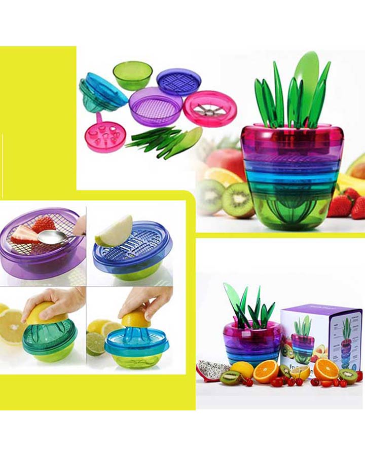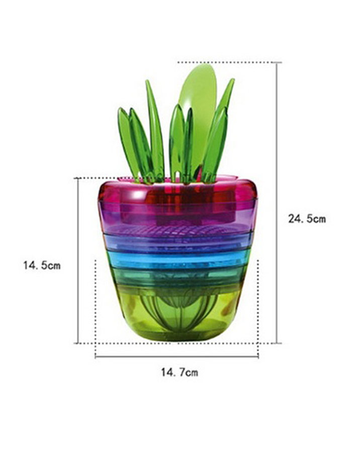 گلدان جادویی Fruits Plant یک محصول بسیار کابردی است که دارای طراحی عالی و هوشمندانه ای می باشد. این محصول 10 کابرد مختلف دارد که از کاربرد های آن می توان به: آبگیر لیمو، قاچ کن سیب، صفحه برش توری، رنده توری شکل، آبگیر گریپفروت و … اشاره کرد. جالب است بدانید برگ های این گلدان هم کاربرد های مختلف دارد! 2 برگ برای برش لیمو و 4 برگ کوچک بعنوان چنگال طراحی شده اند. این گلدان هم یک دکوری فانتزی و شیک برای آشپزخانه شما می باشد و هم یک وسیله 10 کاره بسیار کاربردی!